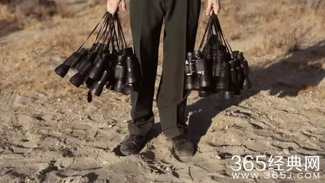 一个穿着白衬衫黑西装裤的男人站在一旁,手里拿着一堆望远镜。