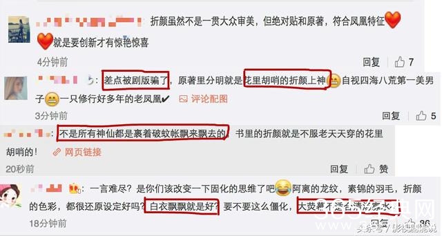 然而尴尬的是吐槽这造型的评论我并没有看到几条,更多的是夸赞这造型好看,还原原著的!每个大号下面都是清一色的好评,说原著里老凤凰折颜就是不服老的,所以要穿的花里胡哨的。