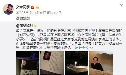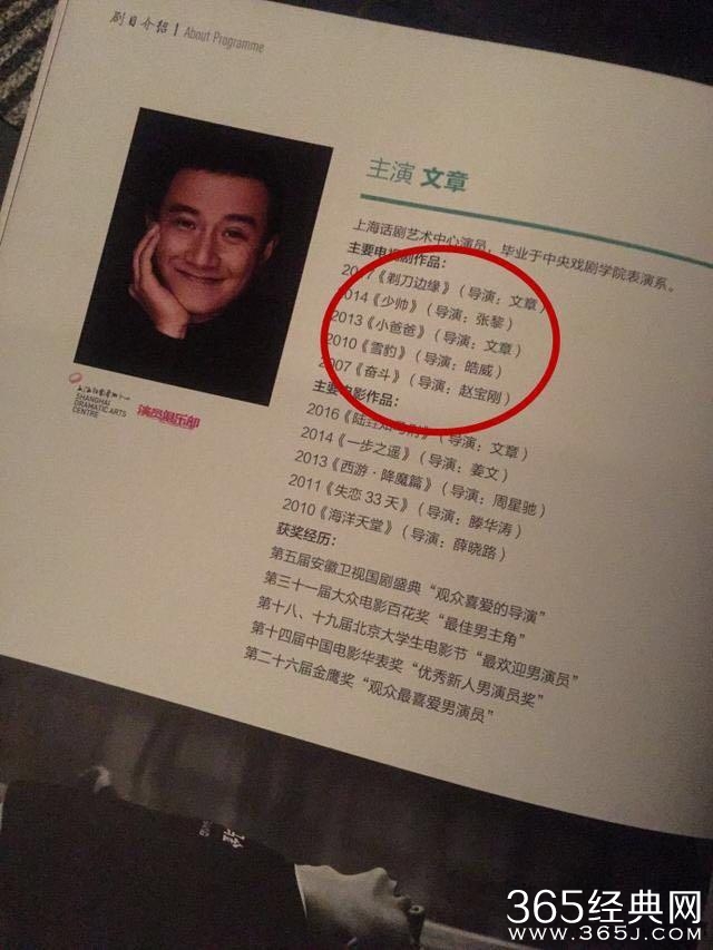 同时,文章也在上海话剧艺术中心表演话剧《每一件美妙的小事》,如今的文章,人气已大不如前,只能自己在微博上低调的宣传。在他转发的一张照片里,引起了网友的注意。原来,其中一部分是关于文章的个人简介,包括主要的电视剧及电影作品等。