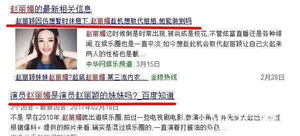 百度一下这个赵丽媚,结果更不靠谱,什么“趁赵丽颖休息要取代姐姐”,感觉分分钟要写出《甄嬛传》的节奏。
