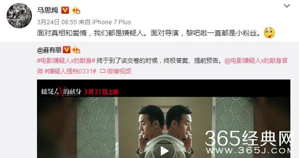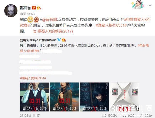 虽然大家最近的重点都在苏有朋最近为了电影越活越像高仿,但也有网友发现,赵丽颖不愧是娱乐圈宣传小能手啊,昨天刚给徐静蕾的新作做了宣传,今天就又帮忙宣传了《嫌疑人X的献身》