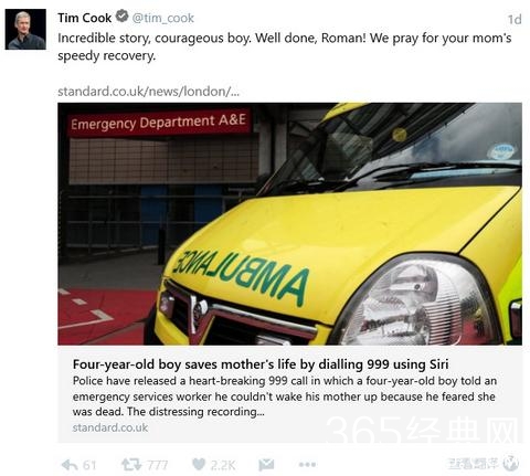 近日,美国一个四岁小男孩及时打急救电话救回妈妈一条命的故事让Siri又火了,因为这个小男孩正是通过iPhone的Siri功能拨打了999,而苹果CEO库克在得知这一消息后还特地发送推文赞扬了这个小男孩的举动。