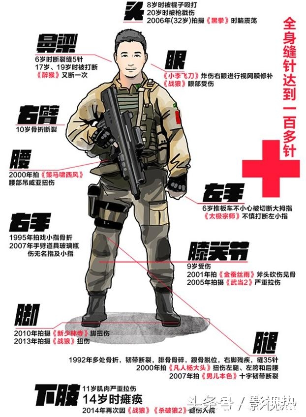 同样敬业的演员还有吴京,身上也是多处受伤