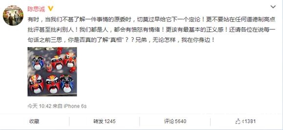 事情发生后,陈思诚还发微博支持王宝强。说无论怎样,自己永远站在他那一边。这一举动赢得了一片的掌声,网友赞其三观正,够义气。