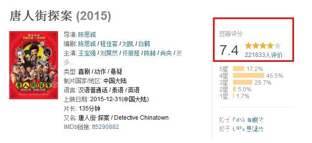 15年,陈思诚拍摄的《唐人街探案》才上映8天,就收获5.2亿的票房。很多网友因为这部电影对陈思诚黑转粉,认可了他的才华。《唐人街探案》在豆瓣上的评分也是有7.4分,这在国产电影中的评分已经算高的了。