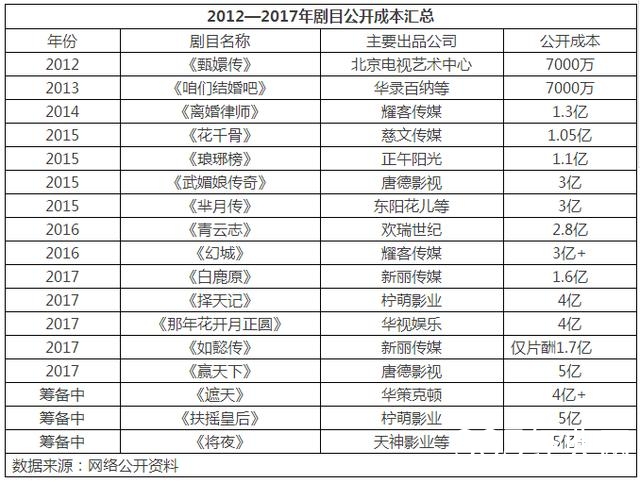 如今电视剧制作成本过亿已是常态。从2015年开始,由《武媚娘传奇》《花千骨》等“爆款”带动,电视剧制作费跨入”亿元俱乐部”。到了2016年,制作费更是节节攀高,欢瑞世纪出品的《幻城》《诛仙·青云志》凭借3亿元的大制作将电视剧市场彻底颠覆。而今年将播的范冰冰大作《赢天下》据称创下了亚洲电视剧单体剧目最大投资,成本高达5亿元。此后,《阿麦从军》《扶摇皇后》《将军》等几部古装大戏也纷纷踏上了“5亿列车”,与《赢天下》遥想对望。仅仅不到五年时间,电视剧制作成本翻了近7倍。无论是电视剧四大巨头公司,还是后起之秀的新公司,基本都奉行“人手一IP+当红明星+巨资堆砌”这三要素在制作新剧。类似的投入放在电影制作上,产出的都将是重工业体量的电影。