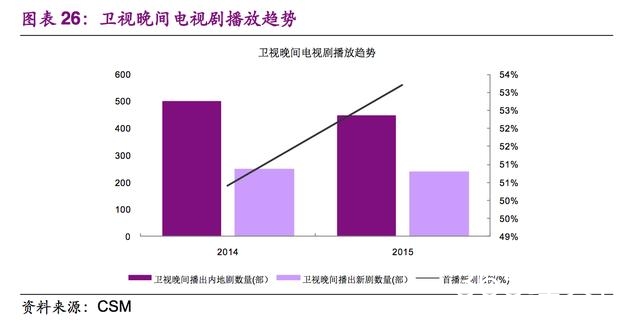 2015年开始“一剧两星”政策实施,旨在消化电视剧产能压力。实际效果 为2015年晚间19:00-21:00时段,卫视共播出内地剧447部(2014年502部), 新剧播出238部,首播新剧比率是53.2%(2014年50.4%),二轮剧比率是46.8%(2014年49.6%),卫视的首播新剧比率确实有所上升,但相对于2014年249部新剧播出量仍少了11部。