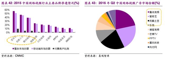 我国网络视频平台经过多年发展集中格局已经形成,爱奇艺、腾讯视频、 优酷土豆在渗透率、广告市场份额均处于行业领先地位。当网络视频进入付 费时代,TOP3 平台的付费用户渗透率也明显领先。前文图表 16 所跟踪的 移动视频 APP 月度活跃用户数也显示了三大平台的突出优势。