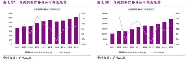 近年来我国电视剧年产量在 400 部左右,2013 年以来每年发行部数有所紧缩,但发行集数仍稳中有升,说明电视剧产能走向高集数大项目扩张而不是项目总数量的增长。