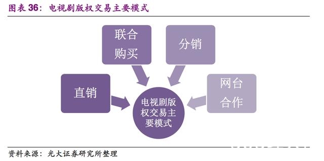 目前国内电视剧主要收入来自版权交易,主要有直销、联合购买、分销 以及网台合作等交易模式。联合购买指电视台以及多个视频网站共同购买某 部剧版权;分销指某个视频网站购买电视剧版权后再分销给其他平台;网台 合作是近年兴起的传统电视台、制作机构、视频网站围绕内容生产制作、播 出、广告推广等进行深度合作的版权交易模式。