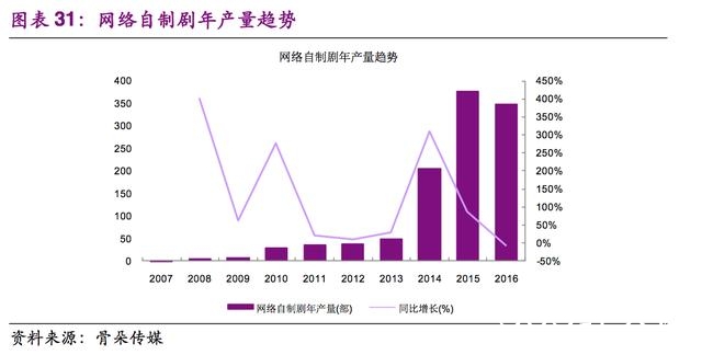 根据骨朵传媒统计,2015 年国内共有 262 部版权剧进入互联网视频平 台播出,意味着卫视首播新剧基本上均进入网络视频平台播出渠道。网络剧 出品数量在 2015 年以后井喷,目前网络剧年产量已达 350 部左右。