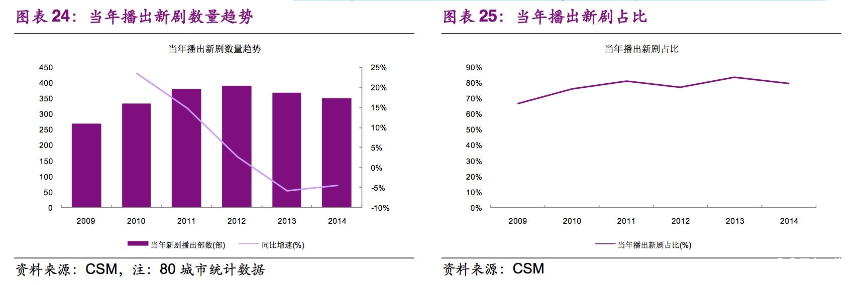 根据CSM统计,2012年以来80城市全天时段每年播出的新剧数量呈现 不断减少的趋势,从播出近400部当年新剧,逐步减少到350部左右;说明电视台每年的电视剧播出容量已经饱和,无法依靠数量无法突破渠道壁垒。