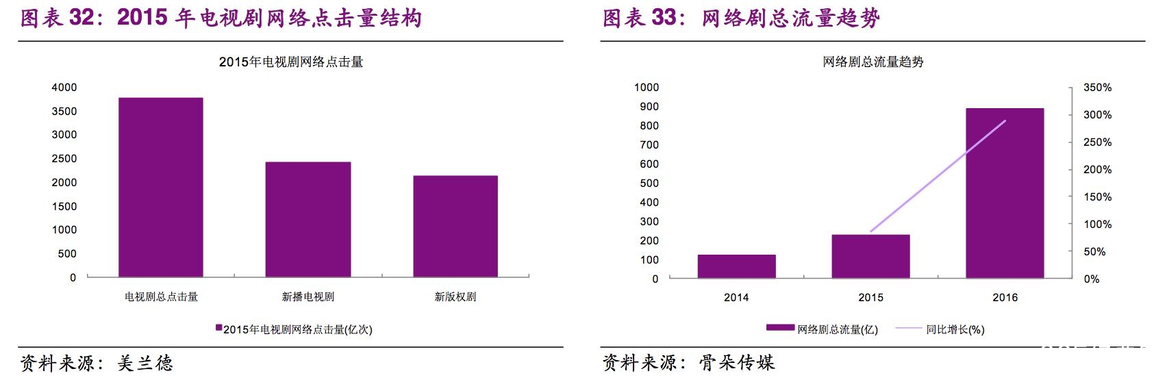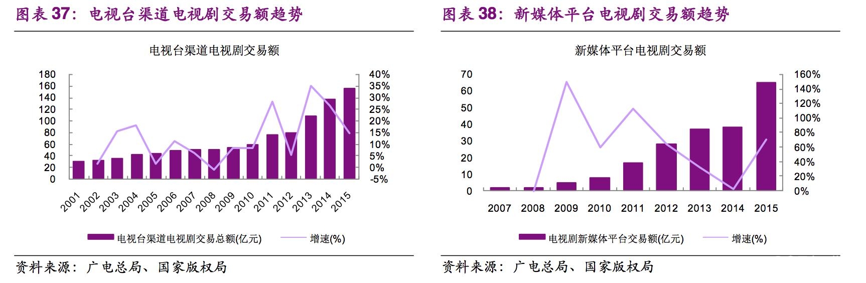 根据广电总局及国家版权局统计,2015 年电视剧版权交易额约 222 亿 元,其中电视台渠道交易 157 亿元,新媒体渠道交易 65 亿元。由于电视台 广告收入已经稳定,新媒体渠道电视剧交易额的快速增长,成为拉动2013-2015 年电视剧总交易额维持年均 20%以上增速的主要因素。