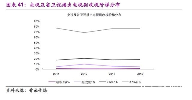 尽管央视及卫视每年可容纳 500 部左右电视剧播出量,收视率则始终呈现“宝塔型”阶梯分布。从 2011 年开始,卫视每年平均收视率在 2%以上的 优质剧占比仅 1%,总数量不超过 10 部,收视率在 1%(含 2%以上)以上 剧目总数不超过 40 部;收视率不足 0.5%的剧目占比则始终高达 75%以上。