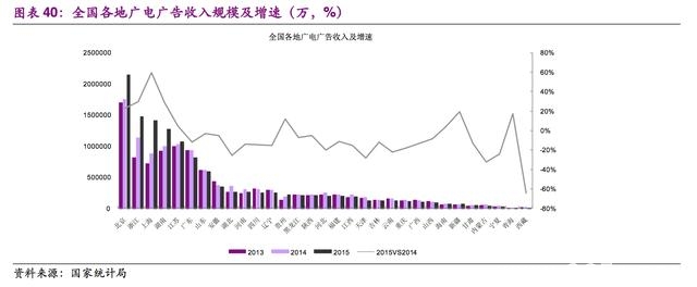 受移动视频崛起冲击,2015 年以来国内广电电视广告收入已趋于下滑。 分地区而言,除了北京、浙江、上海、湖南、江苏五省或直辖市在 2015 年 仍维持广告收入正增长,其余地区普遍下滑。电视剧在电视台渠道的销售, 仅有几大龙头广电集团仍具备增加预算的购买力。