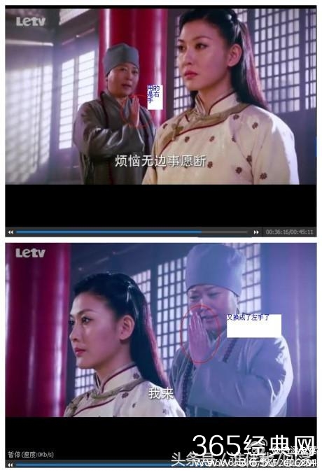 《新燕子李三》中师太先是用右手做阿弥陀佛,镜头换过来又换成左手了