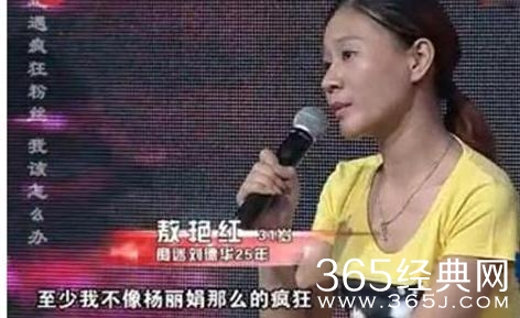 但现在又有一个女生也如此疯狂追求华仔。她叫做敖艳红。来自湖北。因为一次梦中梦到华仔,后来在杂志上见到华仔就陷入了爱情了。据说她为了华仔守身25年,节目中还不允许男主持人碰她一下。而她本人也希望把自己的这些事情传到华仔耳边去,让华仔知道还有这么一个人在迷恋他。