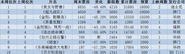 北美票房排行(2017.03.24—03.26,单位:万美元,时光网)