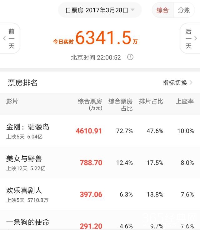 今天(3月28日)大盘虽然有些冷清,但《金刚:骷髅岛》继续在中国内地电影市场高歌猛进。截至22点,该片单日斩获4600万元,上映5天累计票房6.04亿元!而其主要对手《美女与野兽》上映12天仅拿到5.22亿元。这再次证明了简单过瘾的视觉特效大片在中国最受欢迎。