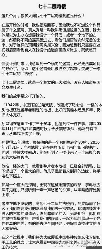 《七十二层奇楼》这个名字听起来,不知道的还以为这是一部悬疑剧,其实不是,这是一档综艺节目,一档由南派三叔参与编剧的节目,这么说这档节目很符合它的悬疑名字,内容也有够神秘的。