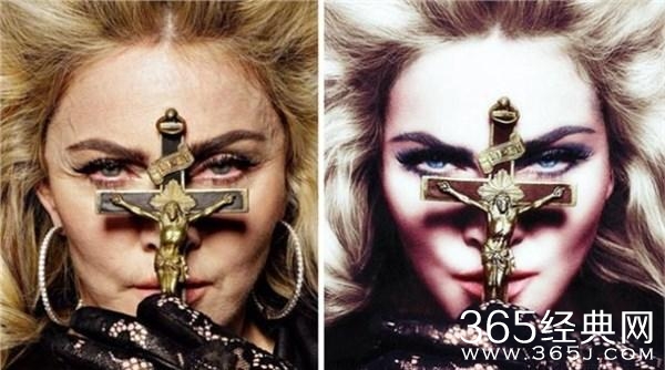 麦当娜阿姨也是常青树,虽然年近五旬,只是这照片PS的确实厉害,把鱼尾纹去掉了,顺便把下巴也削尖了不少,看看右边的图打死我也不信有50岁。