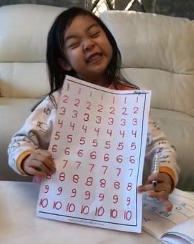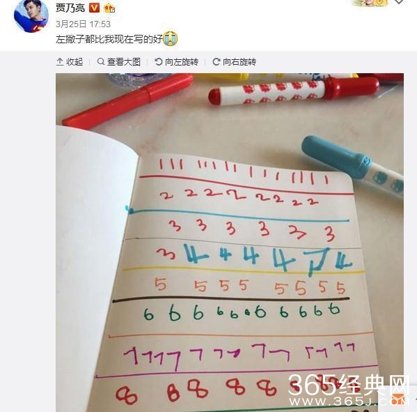 巧的是,这两天贾乃亮也发了条微博,晒出女儿甜馨的练习本,只见甜馨写的数字工工整整又不失童稚,贾乃亮很有自知之明的说“左撇子都比我现在写的好”。