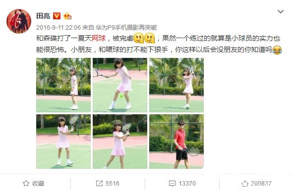 比不过孩子的还有田亮,去年他曾发了条微博说自己和女儿森碟打了一夏天网球,结果被完虐了。