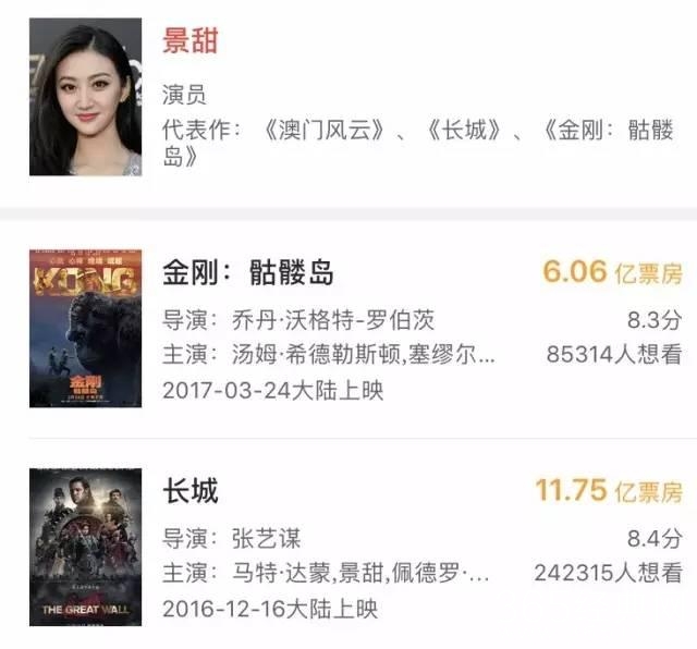 3月24日,景甜出演的《金刚:骷髅岛》中国内地上映,上映6天,票房6.12亿。