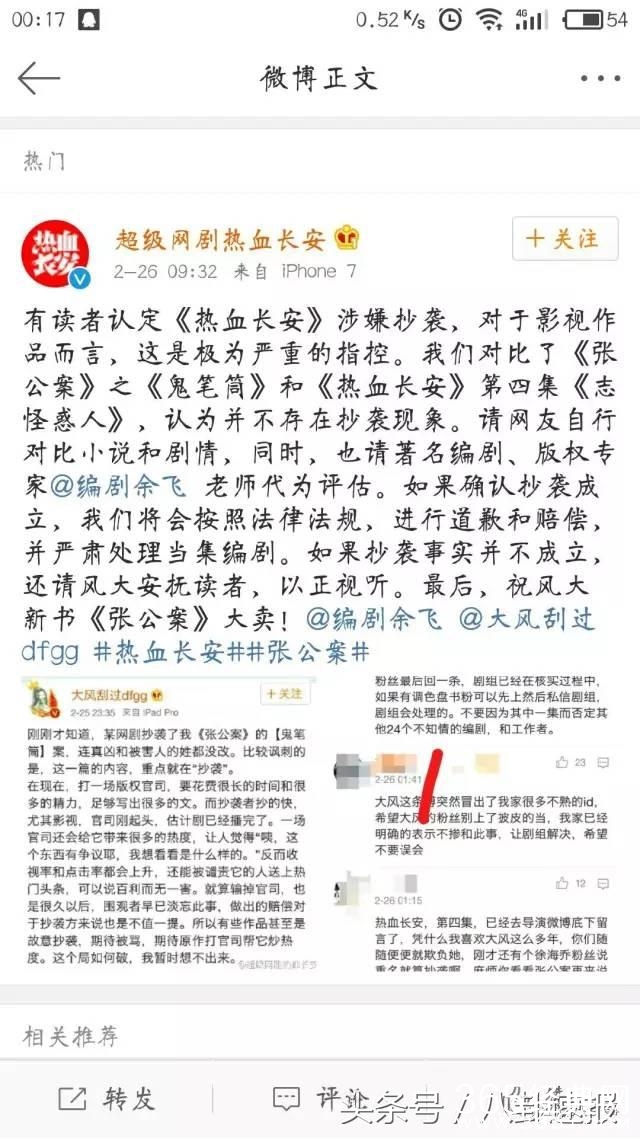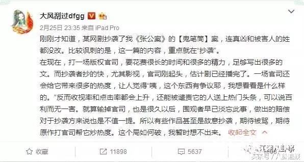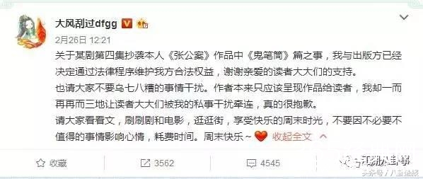 大风刮过得知后,发微博指出某网剧抄袭,并详细解释了《张公案》原案件创作经过及发表时间,但并未提涉嫌抄袭网剧具体名字(提不提的也没多大差别,反正大家也都知道是谁了╮(╯▽╰)╭)