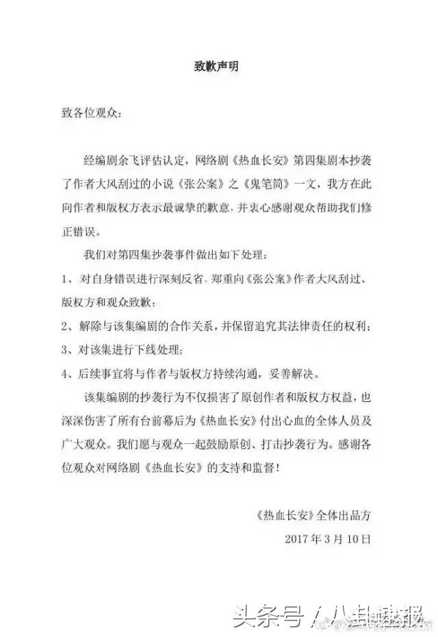 整件事情至此完结,虽然说有网友质疑道歉没诚意,但说实在话,比起那些死不承认的,这态度和后续处理已经算得上是不错了,像编剧余飞所说,还是有一定积极意义的。纵观近几年来涉嫌抄袭的热门IP改编剧,从《花千骨》、《甄嬛传》到已经被起诉的《锦绣未央》,再到前段时间的《三生三世十里桃花》,抄袭已然成风,是是非非,也是难以说清。