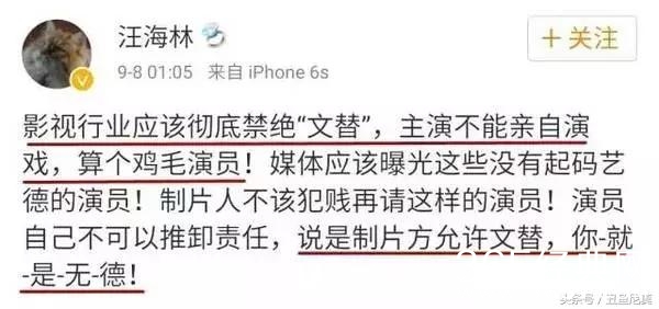 其实,大家都知道文替或者其他什么无关紧要的X替的危害性,但却不能杜绝。这除了因为一些明星自身素养低下,道德涵养不够,职业精神缺乏外,资本、市场,包括一些投资人、导演对这些现象缺乏零容忍,也在很大程度上纵容了文替等替身的盛行。还有一定不可否认的是,文替什么替,对粉丝几乎没有伤害性,这也助长了此等歪风邪气的泛滥成灾。遏制文替等奇葩替身,除了明星本身要自觉外,是不是就很难再找到更加合适的方式方法了呢?答案应该是否定的。