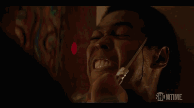 搭配AMC向来的大尺度,就呈现出预告里的写实场景,比如封喉见血的血腥画面: