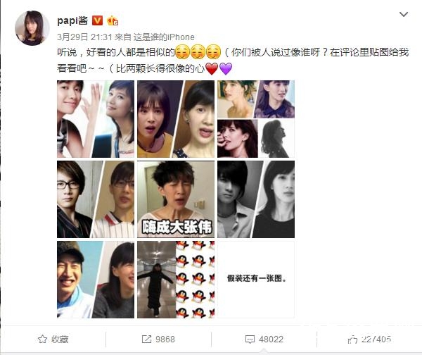 最近papi酱在微博里发了几张自己和明星撞脸的照片,当初她走红的时候大家就觉得她颜值很高,属于那种明明可以靠脸的类型,通过这次她发的照片,我们才发现原来她居然撞脸什么多明星。