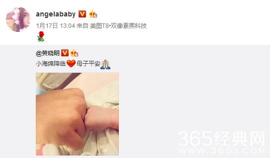 2016年10月8日,黄晓明宣布angelababy怀孕,2017年1月17日Baby在香港诞下他们的爱子“小海绵”。Baby产后2天就出院了,产后8天不坐月子与婆婆逛花市,也因此被传“代孕”。