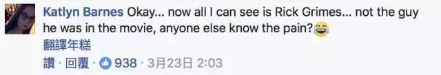 ⬇️译:“一看到他就想到《行尸走肉》的打僵尸的Rick,浪漫戏根本看不进去,有人懂我的痛苦吗?” (938个zan说明还是有的...)