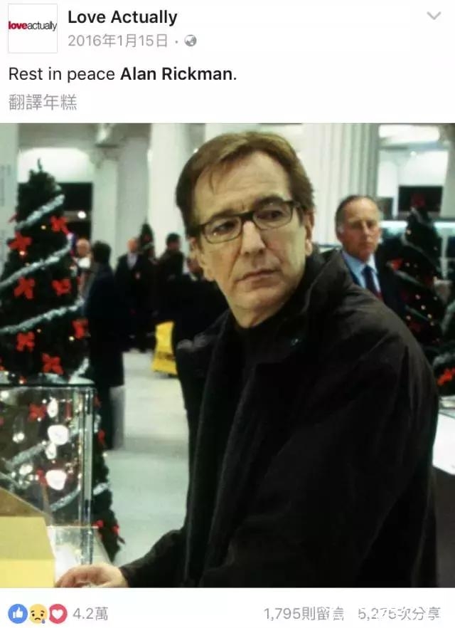 Alan Rickman2016年1月14日因癌症去世,享年69岁。《真爱至上》的官方推特在艾伦去世后的第二天,专门发了推特怀念他。⬇️