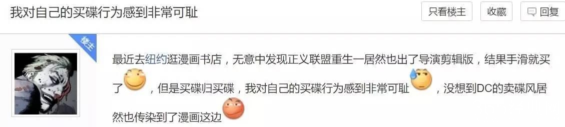去年贴吧有个漫迷网友表示自己去纽约逛漫画店,居然发现《正义联盟重生》也出了导演剪辑版!但按捺不住喜爱的他挣扎后还是买了,尽管他也无奈地表示: