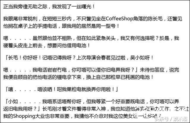 吴君如正在焦急之时,在酒店咖啡厅看到陈可辛,便上前打招呼,眼尖的吴君如看到对方居然与自己是同款手机,“你好我是吴君如,上次我们在酒会见过,我手机电池突然有点问题,你可不可以借电池给我打个电话?”