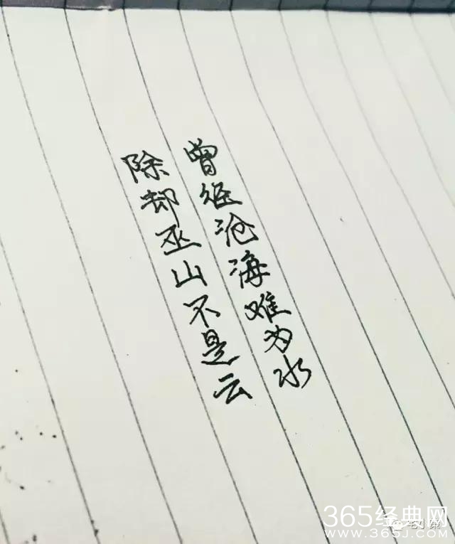 见过汹涌的大海,它方的水便不值得一提;除却巫山彩云,别处的云就相形失色。信步经过花丛,却懒得回头一看,一半是因为修道,一半是因为想你。