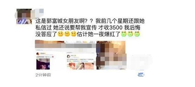 她的资料被曝光之后,微博上很有的好友和消息都删除了,还有网友晒出说,方媛要给她做广告,收3500块,她觉得不划算,这下后悔了。