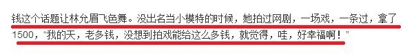 然后林允在和记者的交谈之中,给娱记宝宝一个很深的印象就是,三句话离不开“钱”,而林允的金钱观,真的是让娱记宝宝大吃一惊