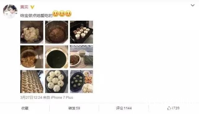 除了九宫格的美食照片,黄奕就说了一句:“给宝贝做点她爱吃的!”