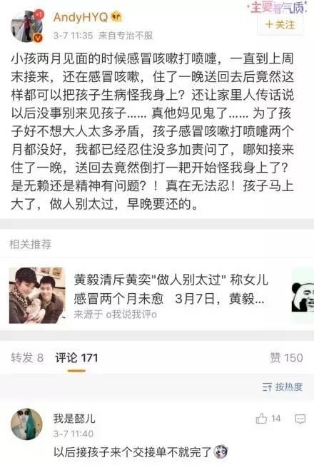这个月月初的时候,黄毅清还在微博骂黄奕推卸责任,明明自己没照顾好感冒的女儿,反倒是赖自己身上。