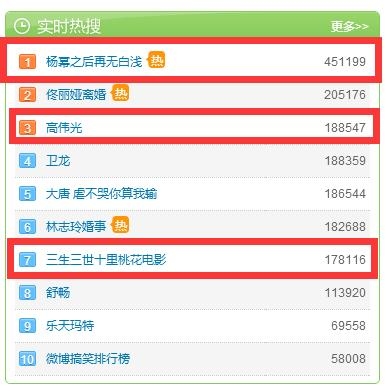 直至大结局时,《三生三世》的热度依然有增无减,不仅如此,“杨幂之后再无白浅”之说突然空降微博热搜稳居首位,而影版《三生三世十里桃花》却排倒数位置。