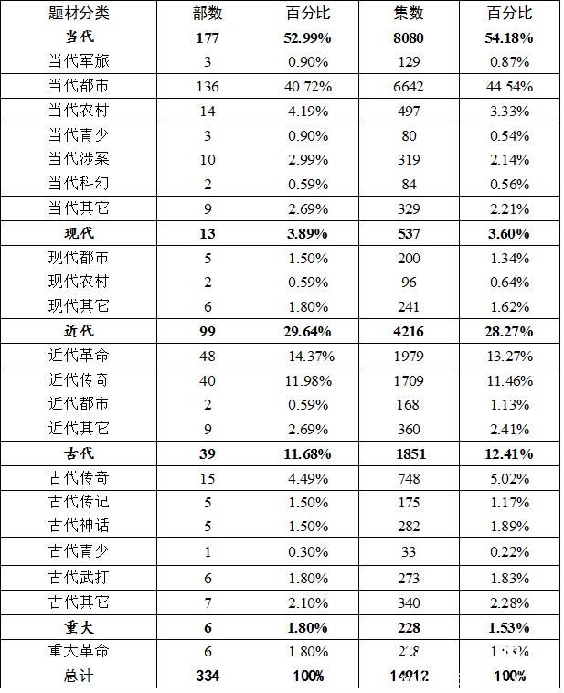 重大题材共计4部143集,分别占总部、集数的3.31%、2.53%。