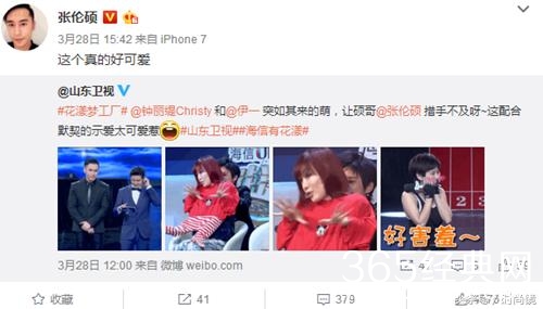 3月28日,张伦硕转发了一条老婆钟丽缇在真人秀节目中卖萌的微博,并称爱妻十分可爱