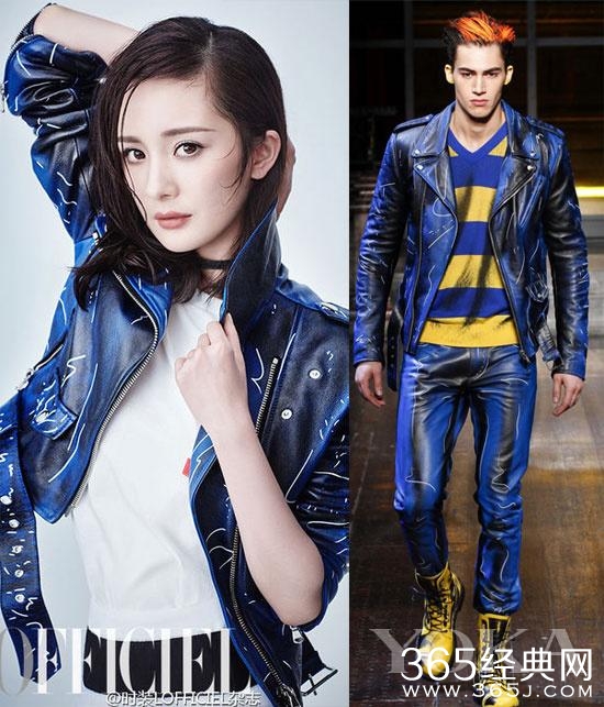 《时装L'OFFICIEL》5月刊封面上,杨幂就身穿Moschino 2016秋冬男款机车夹克。