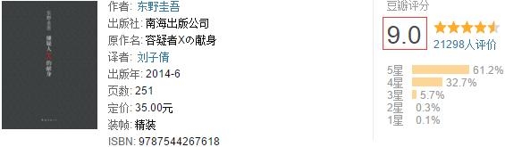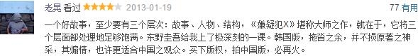 “一个好故事,至少要有三个层次:故事、人物、结构,《嫌疑人x》堪称大师之作,就在于,它将三个层面都处理地足够饱满。东野圭吾给我上了极深刻的一课。韩国版,拖沓之余,并不损原著之神采,其煽情,也许更适合中国之观众。买下版权,拍中国版,必再火。”