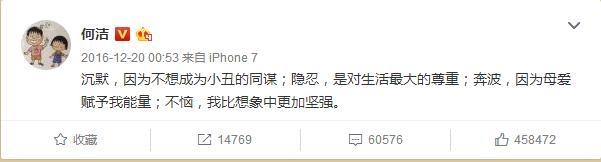 直到在2016年12月20日,何洁终于忍不住了在微博中发声:“沉默,因为不想成为小丑的同谋;隐忍,是对生活最大的尊重;奔波,因为母爱赋予我能量;不恼,我比想象中更加坚强。 ”,证实自己与郝子铭的婚姻存在问题。