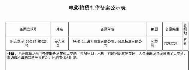近日,广电总局电影项目备案新鲜出炉,《美人鱼2》也在其中并且剧情也有相应曝光,在《美人鱼2》中讲述了:龙天娜和龙剑飞带着能任意穿梭太空的“飞虫计划”出现,刘轩复出商场,人鱼珊珊误打误撞成了太空员,渐纠缠不清的四角关系背后,还隐藏着惊天阴谋。